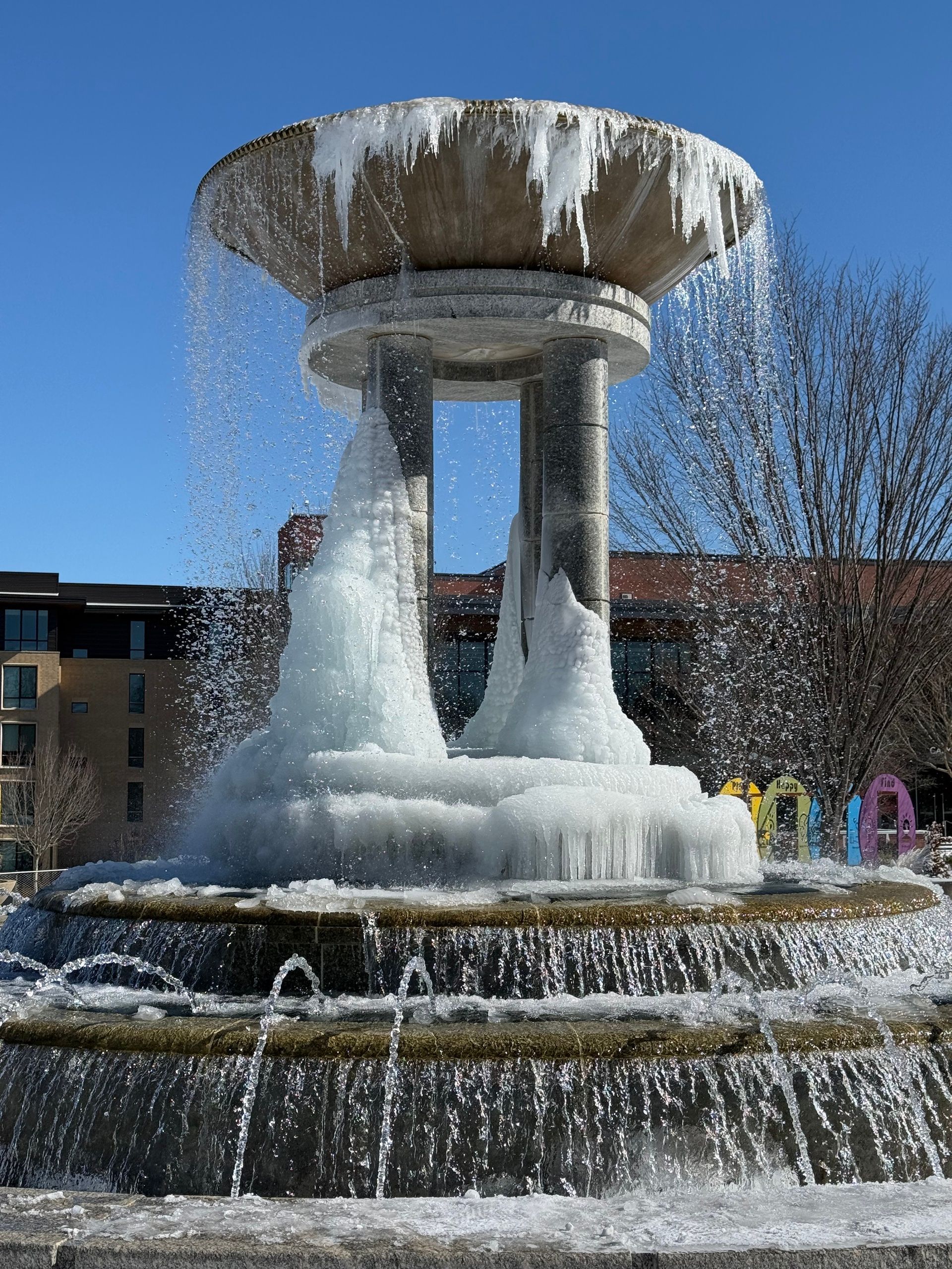 Downtown Cary Park's frozen fountain became the most photographed spot in Cary over the weekend, with dramatic ice formations creating a temporary winter sculpture.
